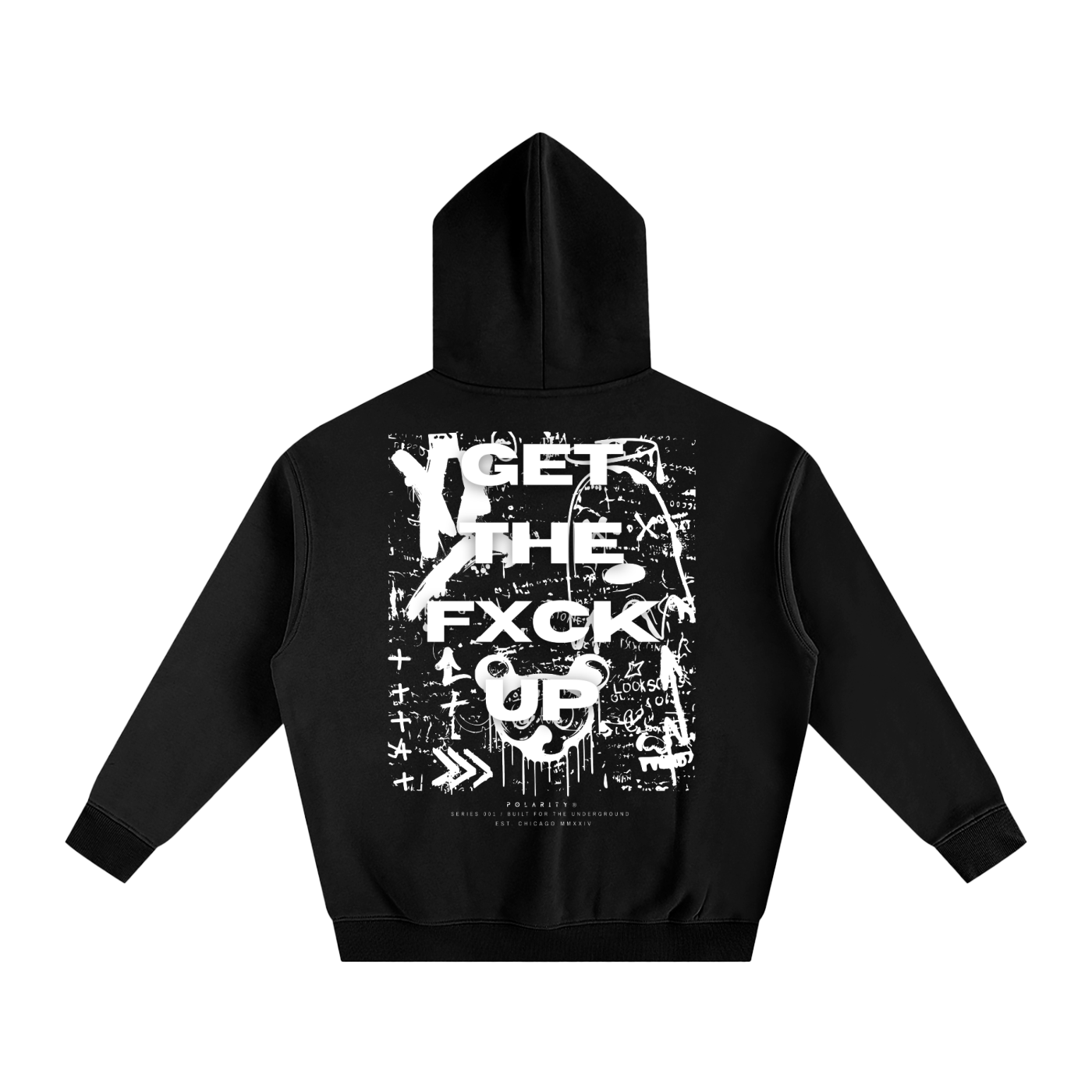 Oversized, super-comfortable cotton-blend hoodie built for the Get The Fxck Up anniversary drop. Heavyweight feel with a relaxed, street-ready fit. Soft interior, structured exterior, and clean lines that match the underground aesthetic. Designed for late nights, early mornings, raves, studio sessions, and everything in between.